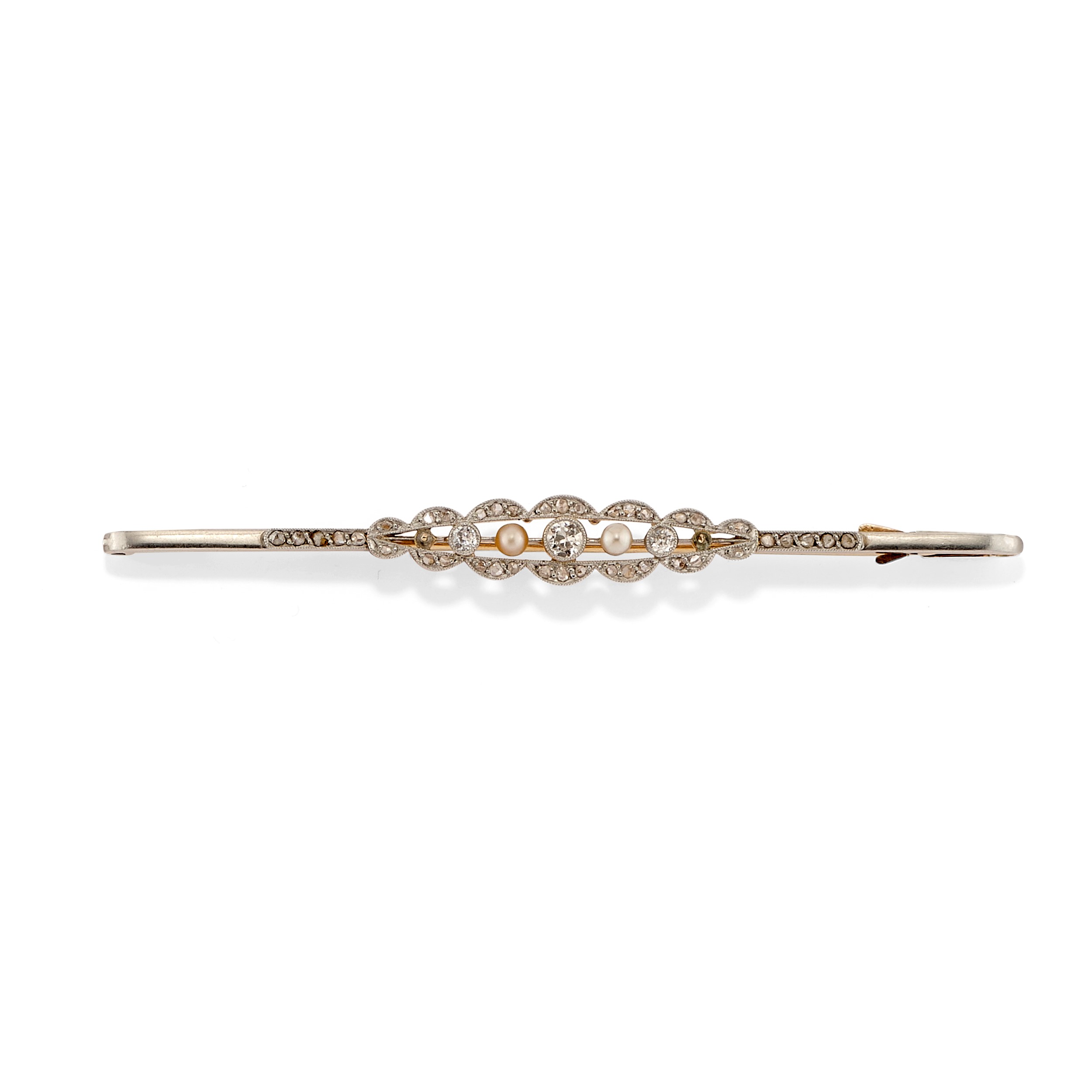 a barretta, decorata al centro da diamanti taglio vecchio e rosa con piccole perle (prob. naturali), punzoni francesi.