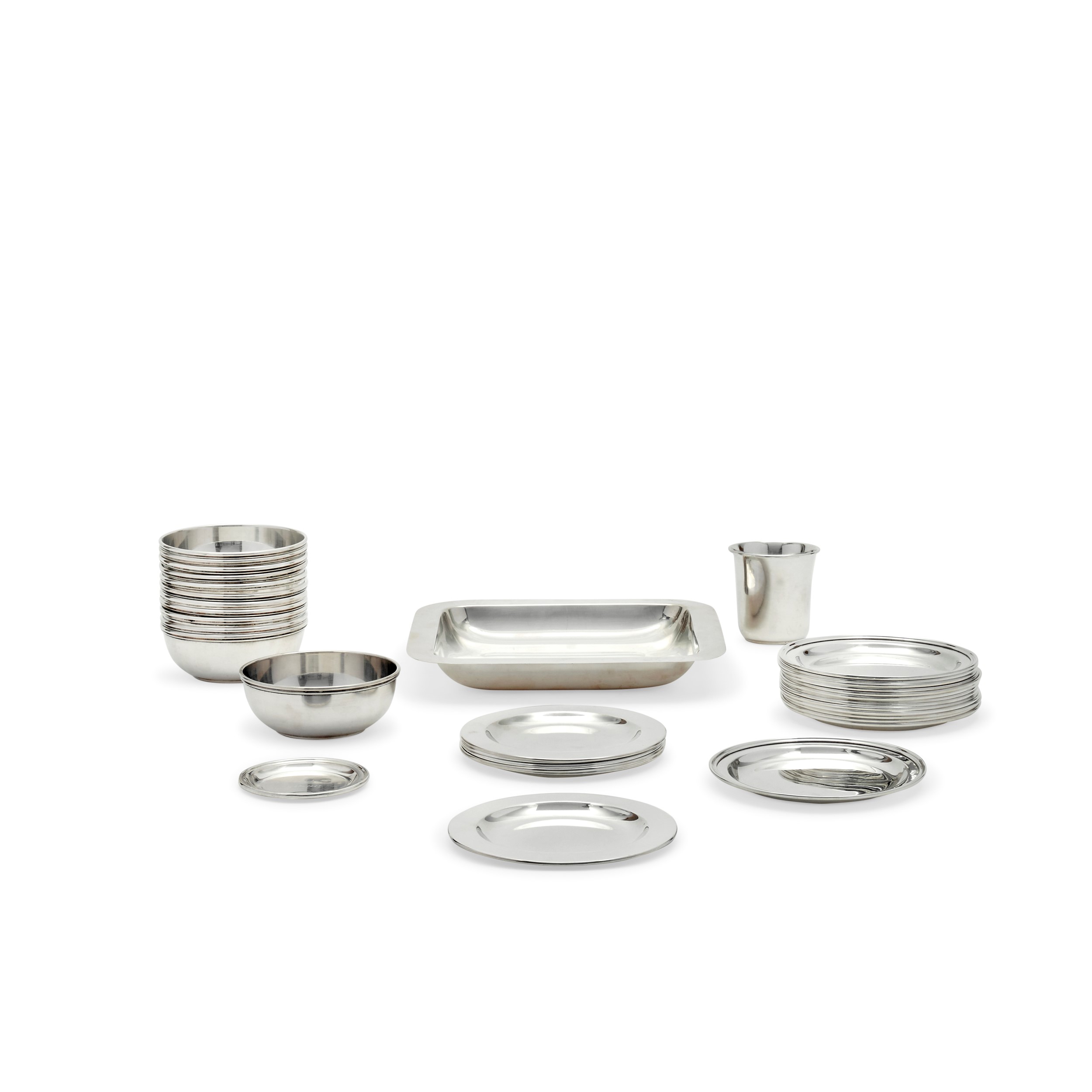 un centrotavola di forma quadrata, un bicchiere, un piattino con incisione, dodici ciotole lavadita, quattordici piattini porta pane, cinque piattini porta pane con bordo liscio.