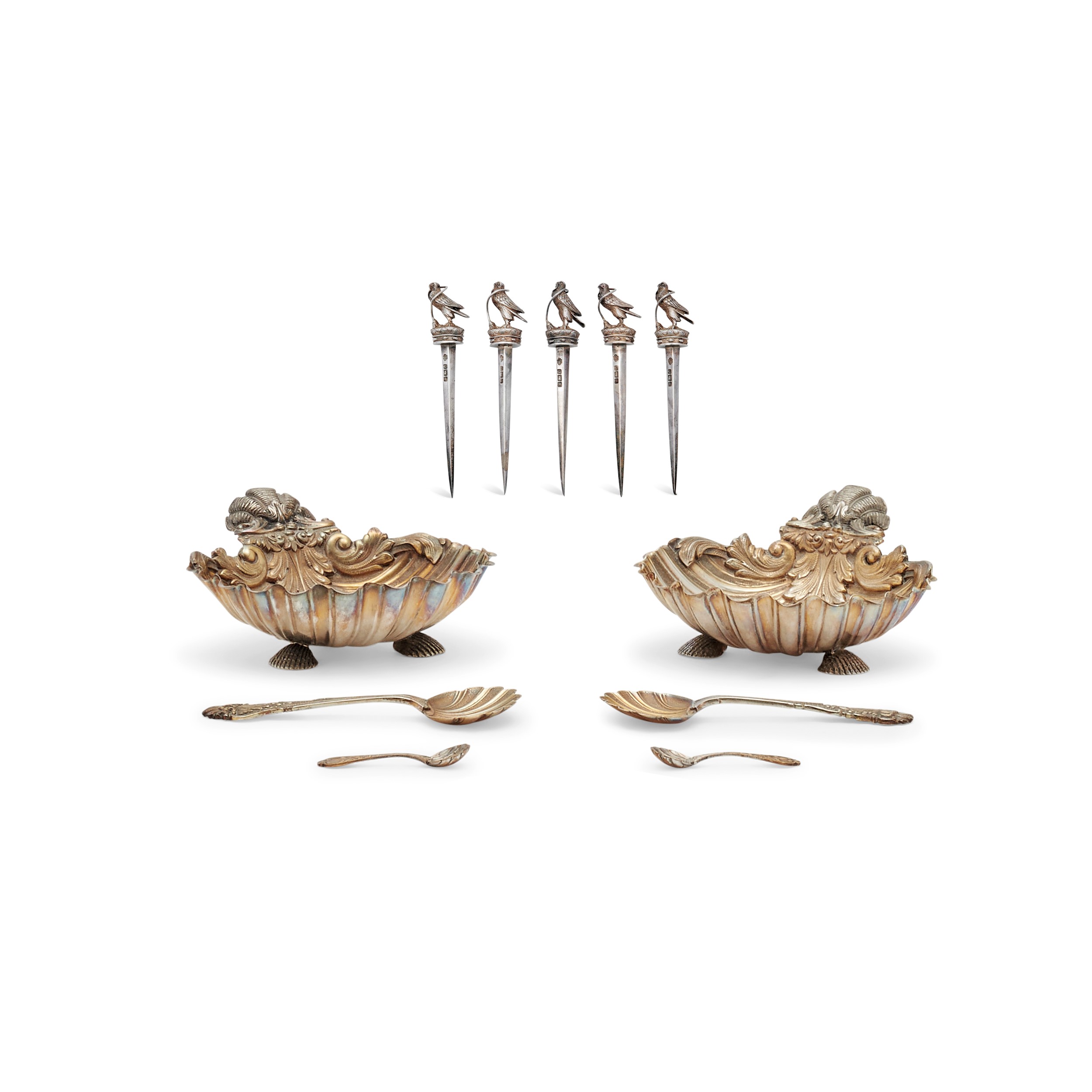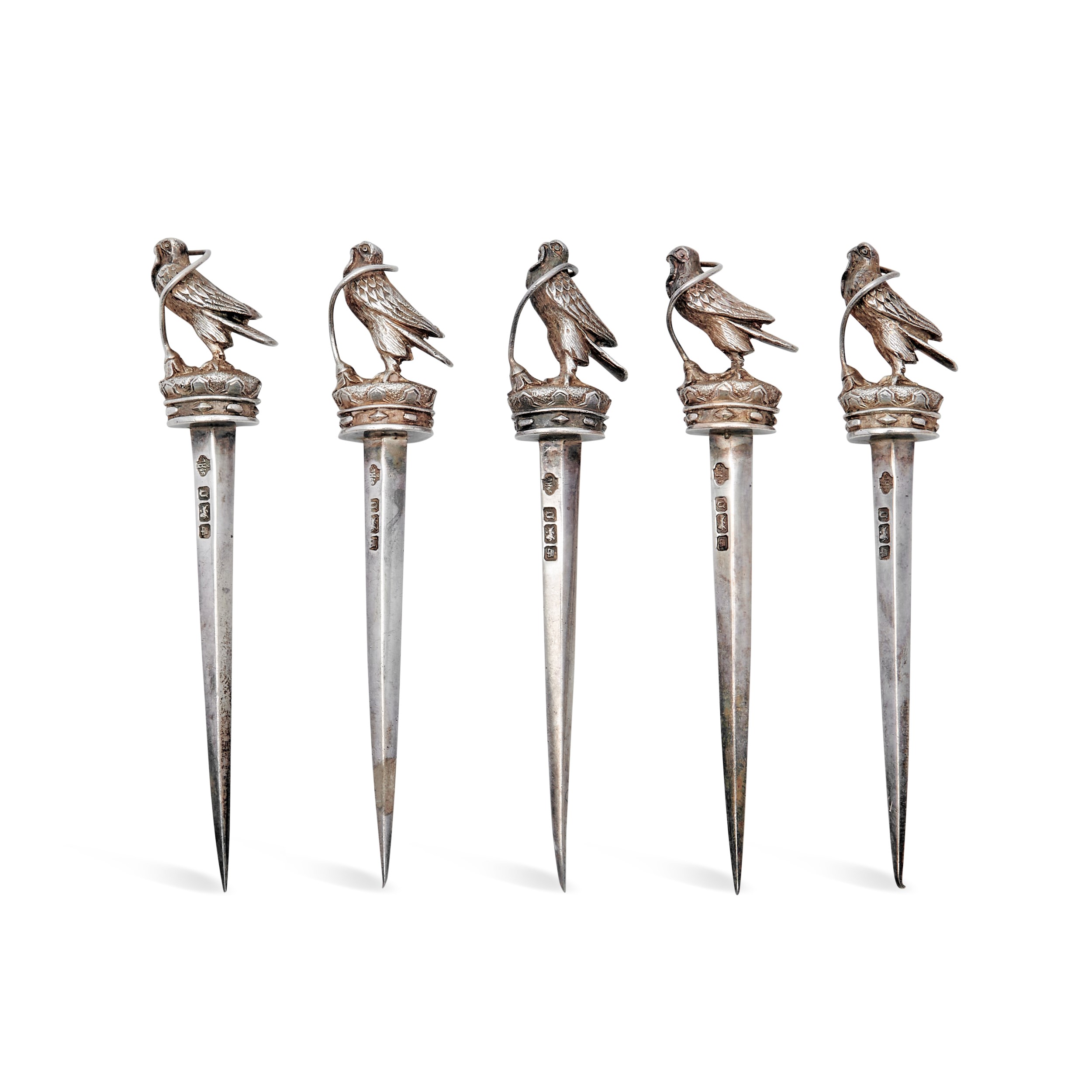 composti da: due saliere di forma a conchiglia con quattro cucchiaini e cinque stecchini sormontati da falco su corona.