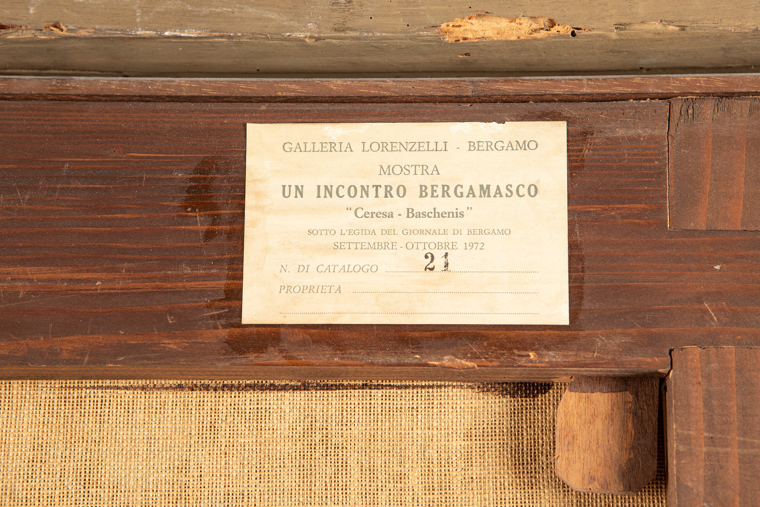olio su tela, cm 74 x 62,5 al retro, sul telaio, etichetta di provenienza: Galleria Lorenzelli - Bergamo / Mostra / Un incontro bergamasco / Ceresa - Baschenis / Sotto l'egida del giornale di Bergamo / Settembre - Ottobre 1972 / N. di catalogo 21