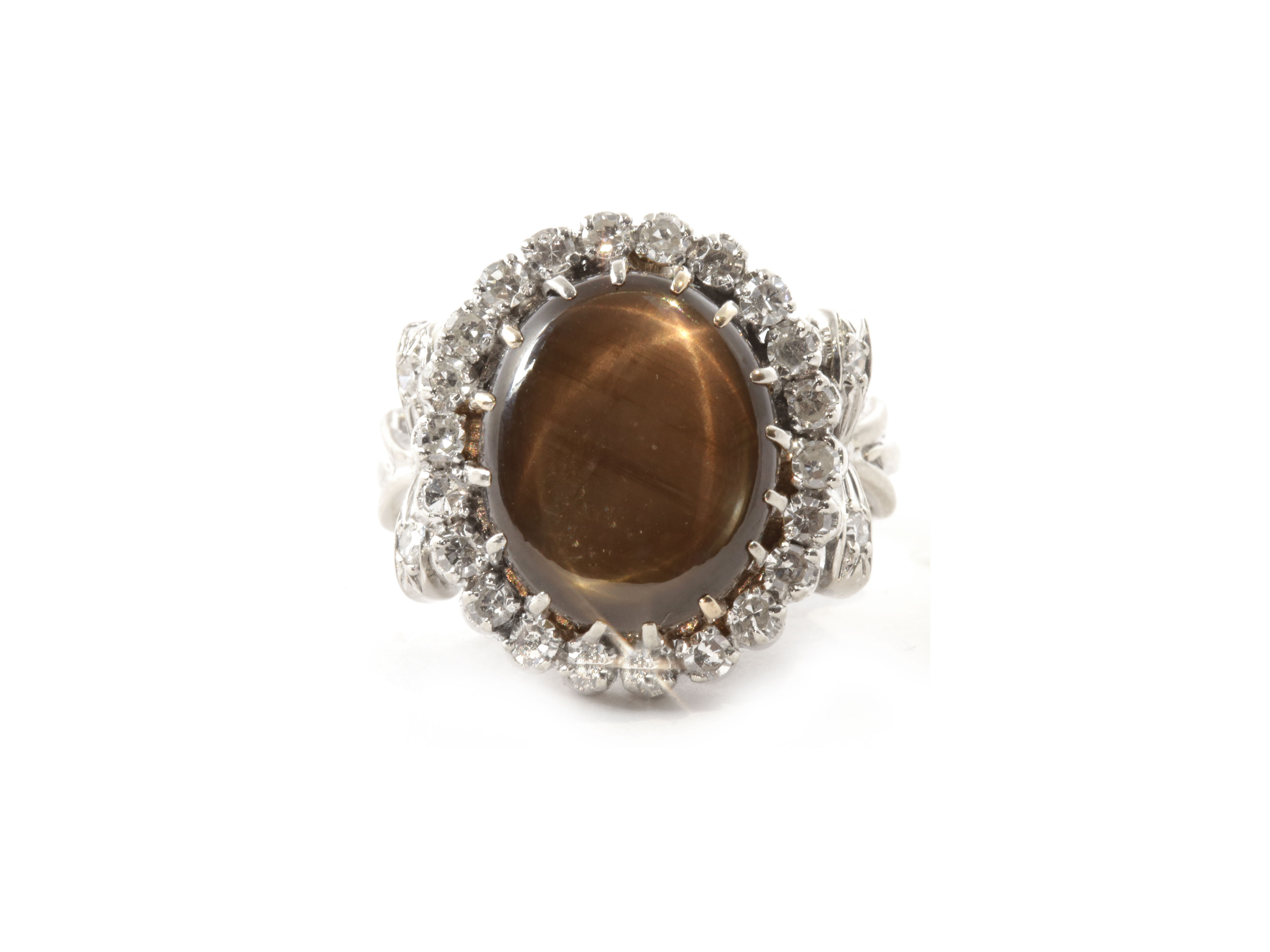 Anello in platino con diamanti e corindone grigio bruno stellato