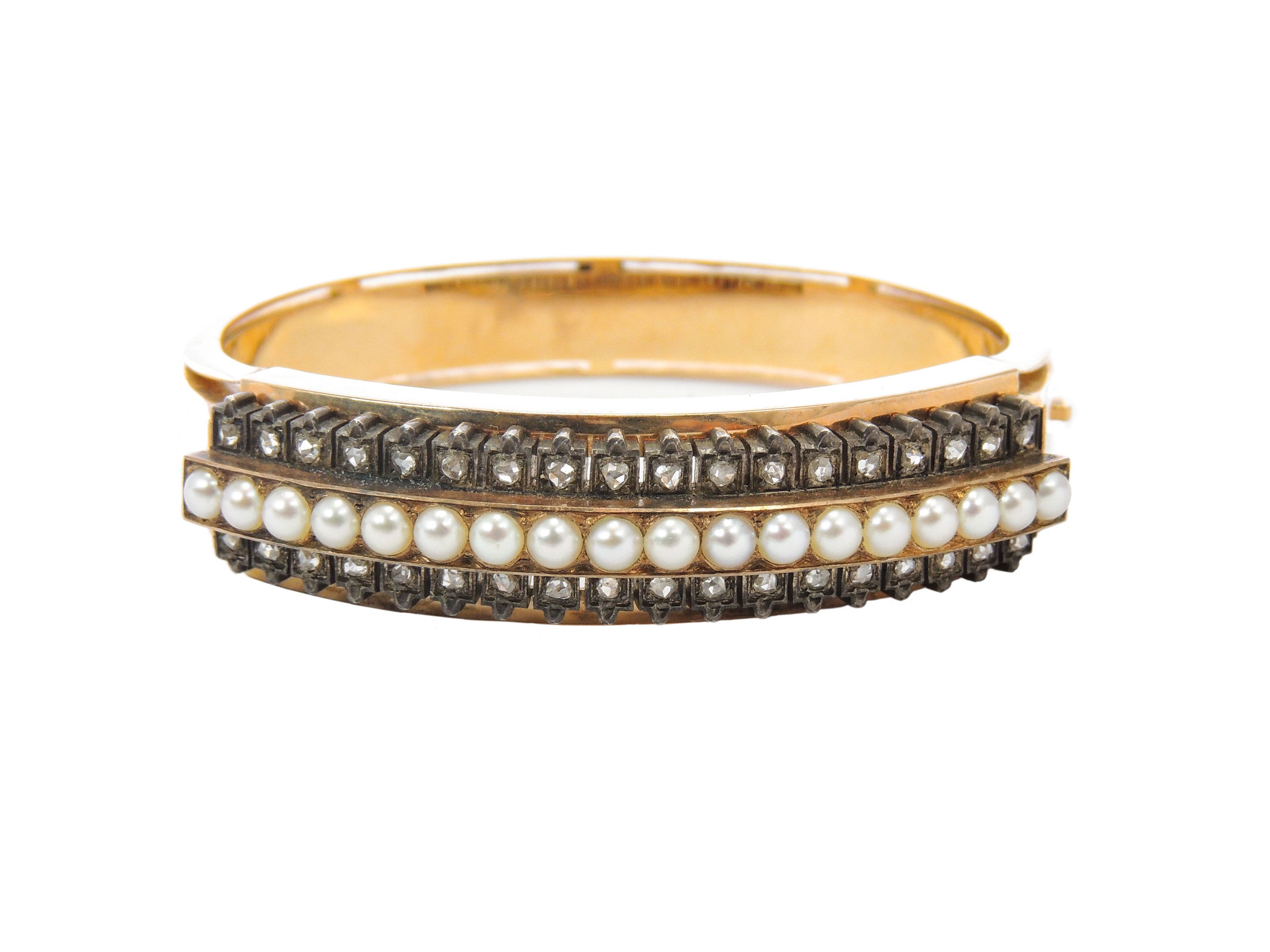 Bracciale rigido in oro rosa e argento con diamanti e perle coltivate