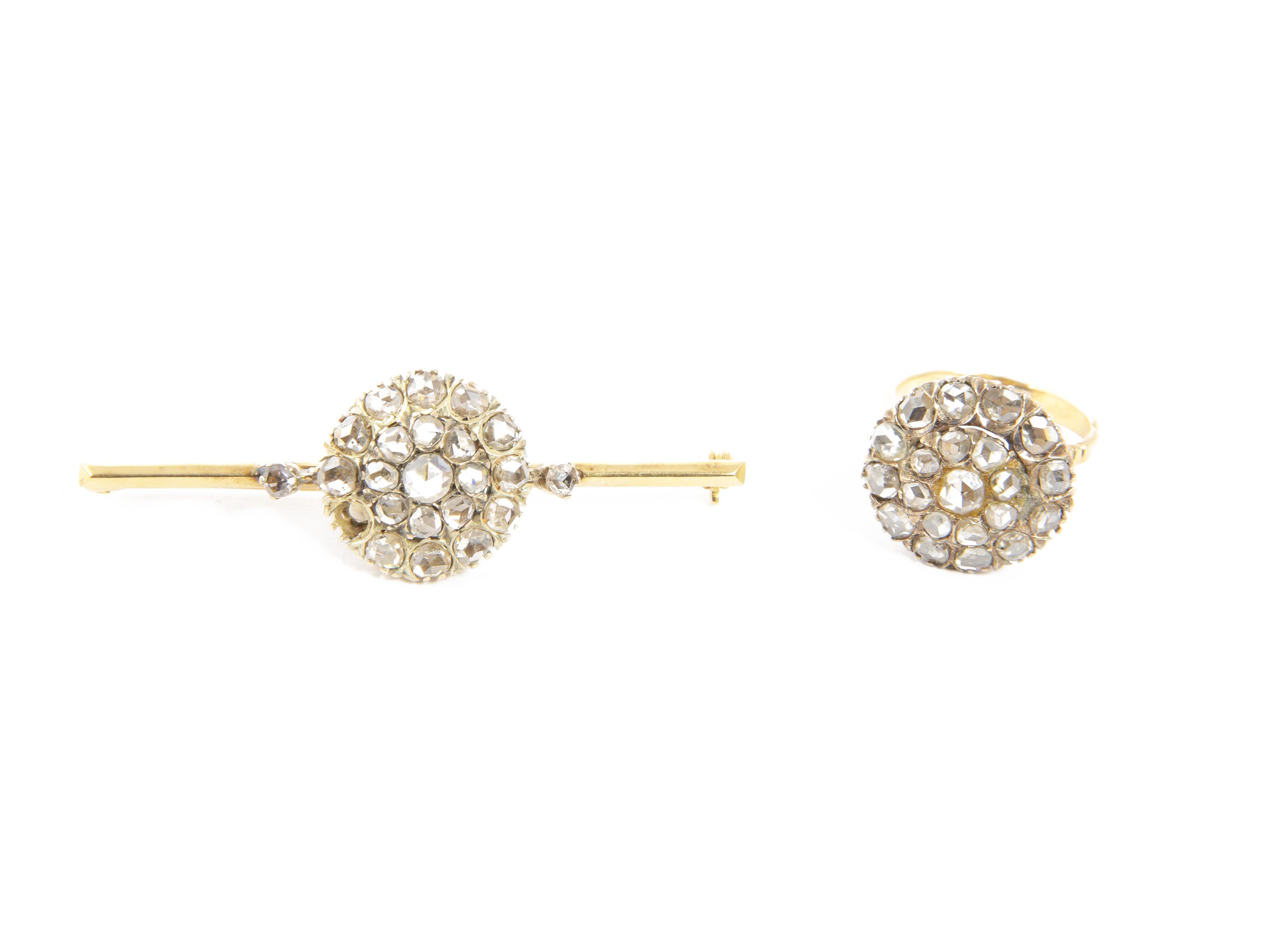 Demi parure anello e spilla in oro giallo e argento con diamanti
