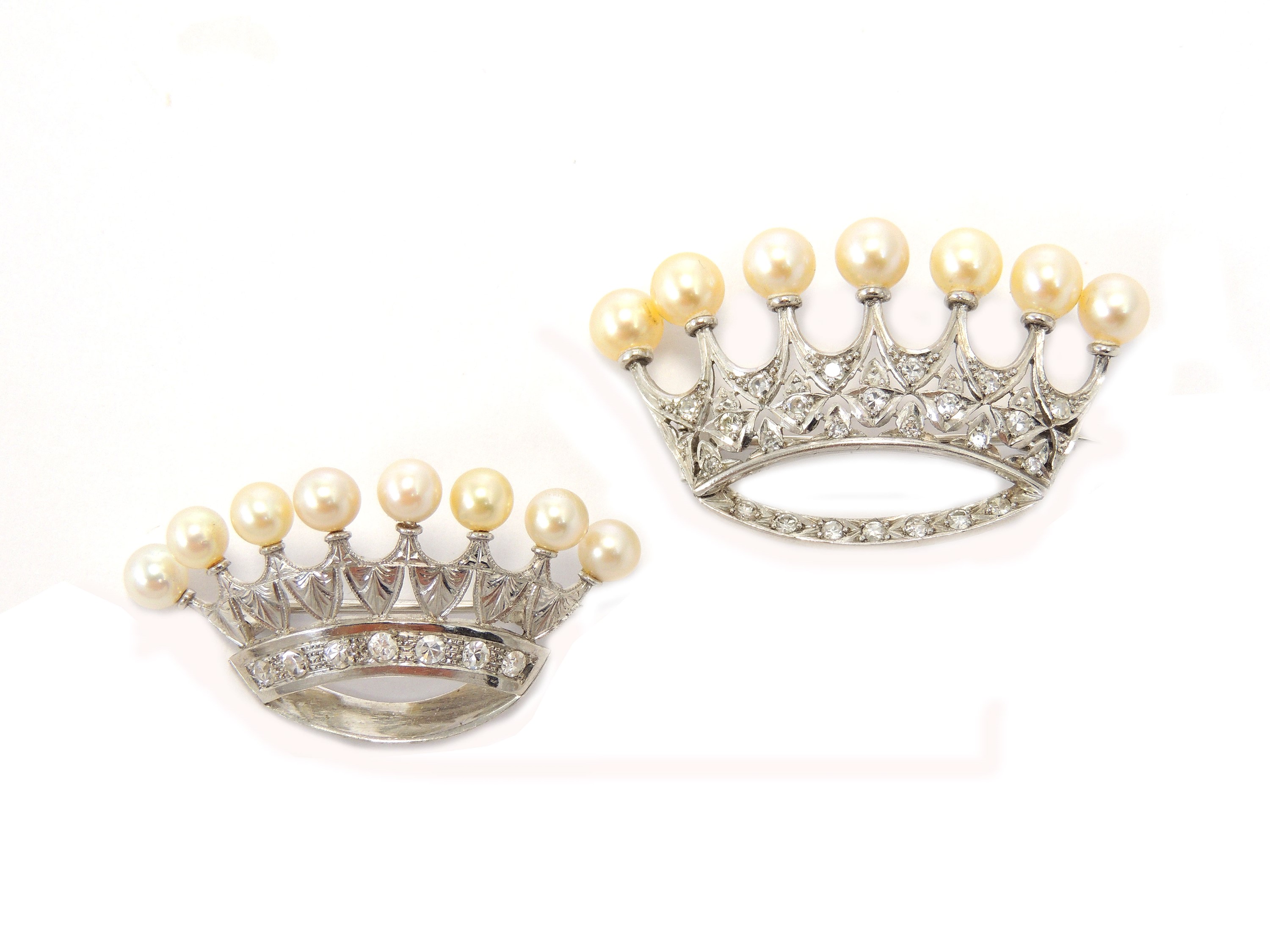 Due spille a corona in oro bianco, diamanti e perle Akoya