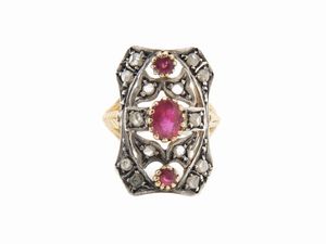 Anello in oro giallo e oro rosa a basso titolo con diamanti, rubini e smalti bianchi [..]