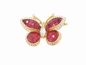 Spilla in oro giallo con diamanti e rubini sintetici