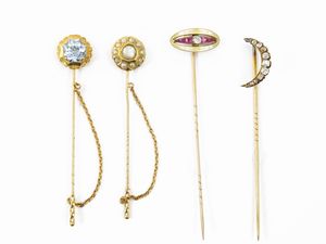 Quattro spille in oro giallo a vario titolo con diamanti, rubini, perle e spinello [..]