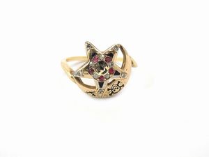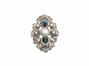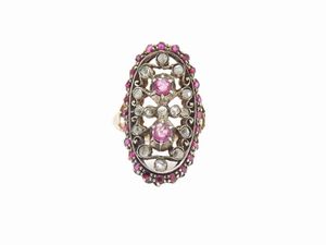 Anello in oro giallo e oro rosa a basso titolo con diamanti, rubini e smalti bianchi [..]