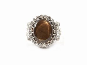 Anello in platino con diamanti e corindone grigio bruno stellato