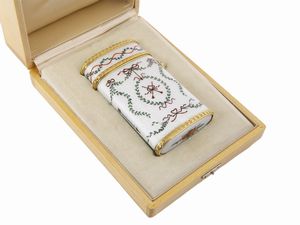 Portasigarette in oro giallo e argento con pietra di luna e smalto bianco
