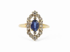Anello in oro bianco e giallo con diamanti e zaffiro