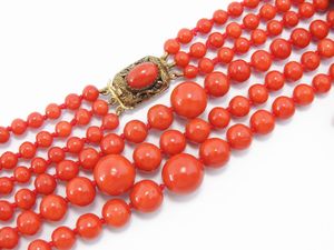 Collana tre fili di corallo rosso con fermezza in argento