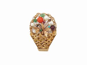 Spilla in oro rosa e giallo con smeraldi, granati, perle coltivate, corallo rosso [..]