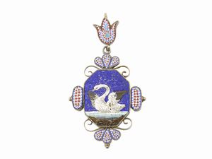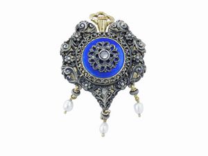 Pendente portaritratto in oro giallo, diamanti, rubini, madreperla e smalti blu