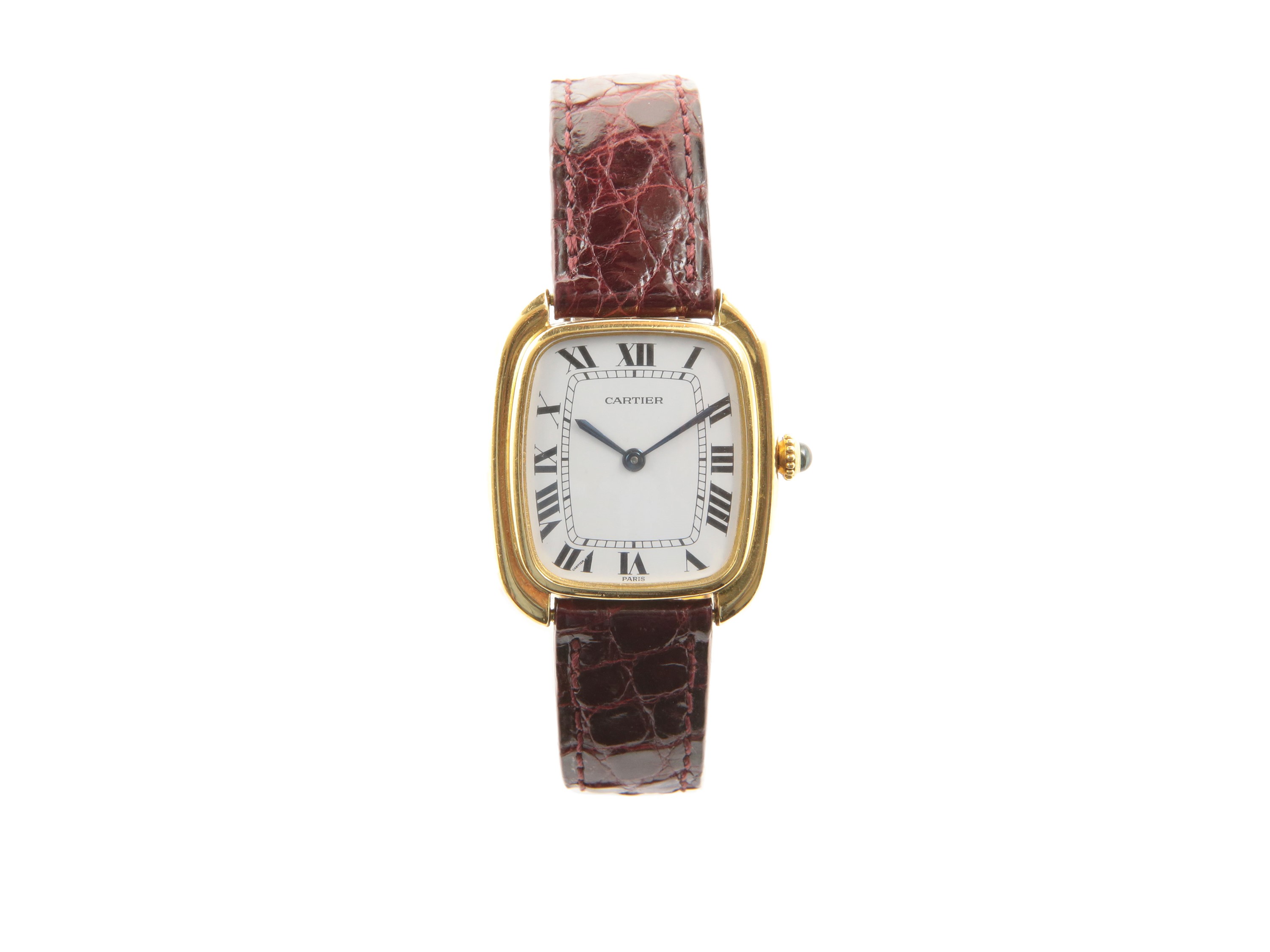 misure cassa mm 26x31 Anni ottanta movimento meccanico automatico, cassa n 170100150, quadrante bianco con numeri romani neri, cinturino in pelle bourdeaux originale, deployante di produzione italiana in oro giallo. Funzionante, consigliata revisione.
