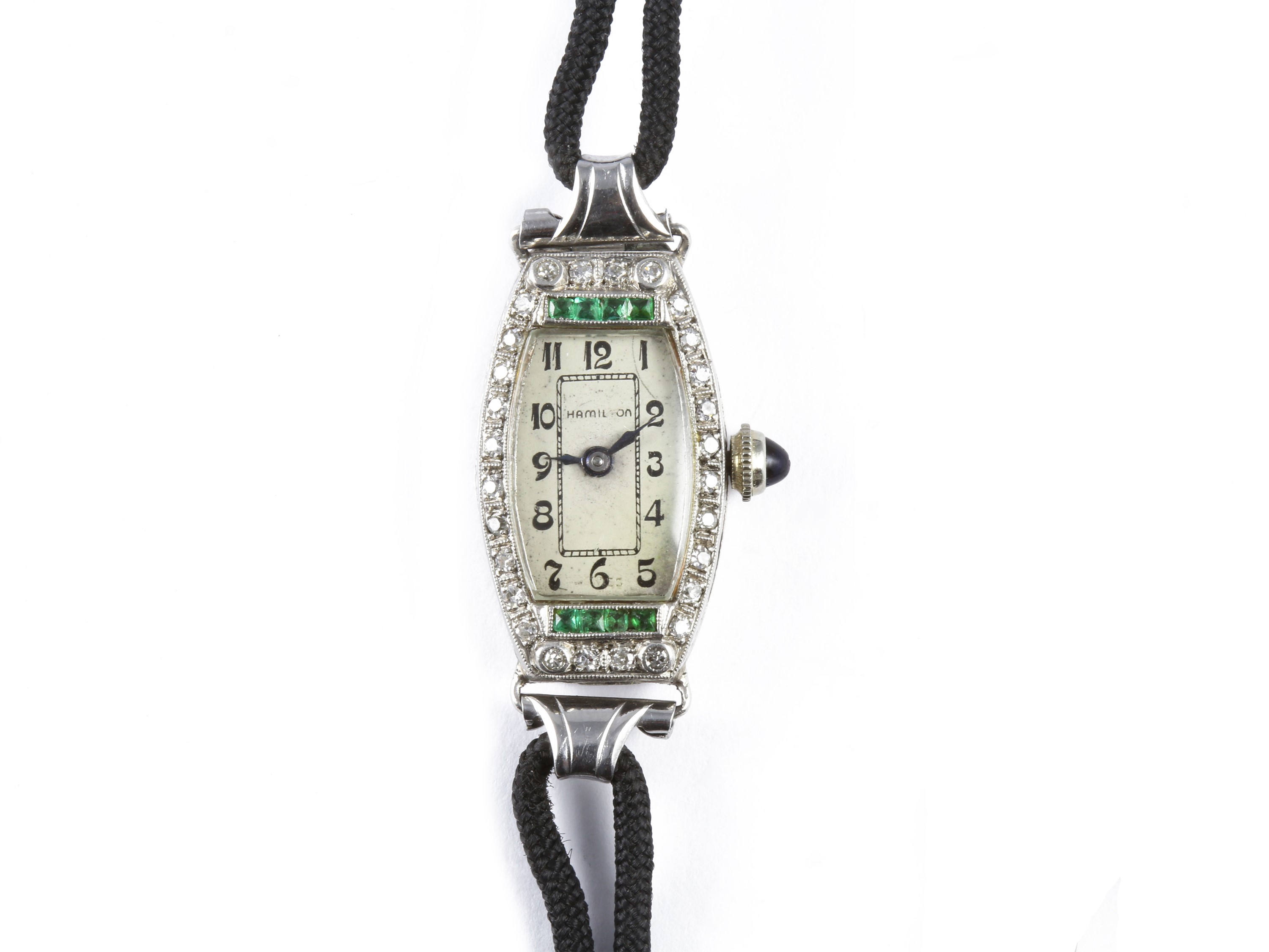 Orologio decò da polso per donna Hamilton in platino con diamanti e smeraldi