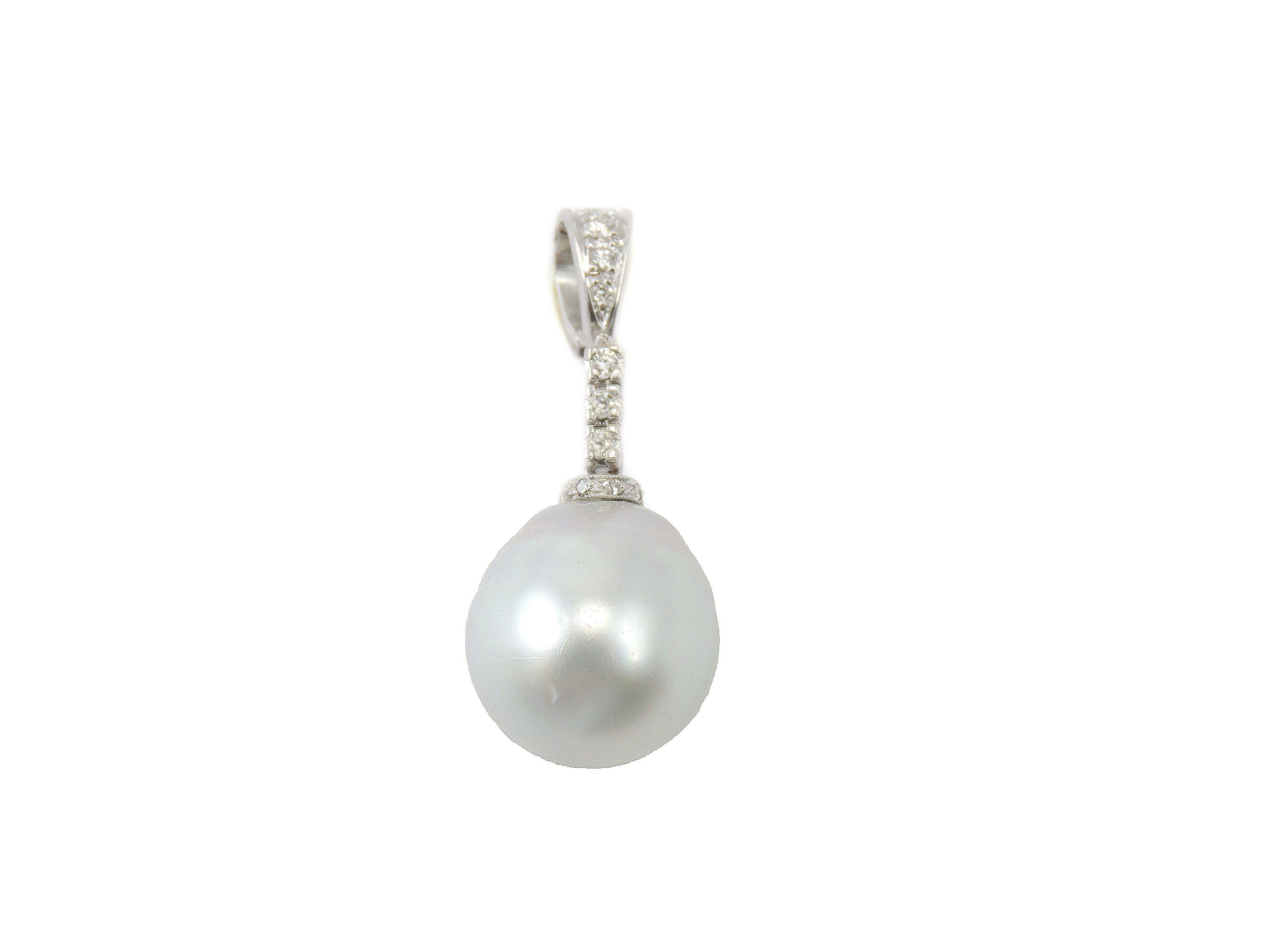 Pendente in oro bianco con diamanti e perla coltivata barocca bianca