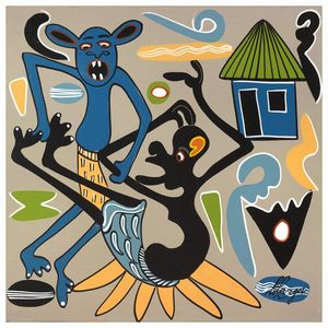 GEORGE LILANGA (Tanzania 1934 - 2005) Twende nyumba ni baba anaku ita haraka tempera su compensato cm 30x30 firmato [..]