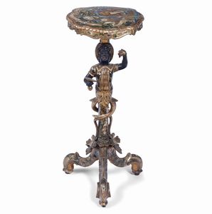 Gueridon in legno dorato, sostegno a figura di moro e piedi a volute vegetali. XX [..]
