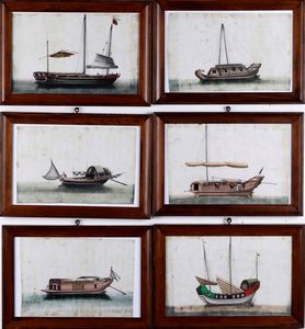 Gruppo di sei piccoli dipinti su carta di riso a tema marinaro raffiguranti barche. [..]