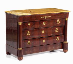 Cassettone impero in piuma di mogano e mogano. Francia, XIX secolo