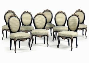 Salotto Luigi Filippo in legno intagliato, ebanizzato e dorato. XIX secolo