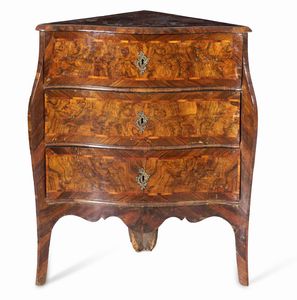 Angoliera lastronata in radica e filettata. XVIII secolo