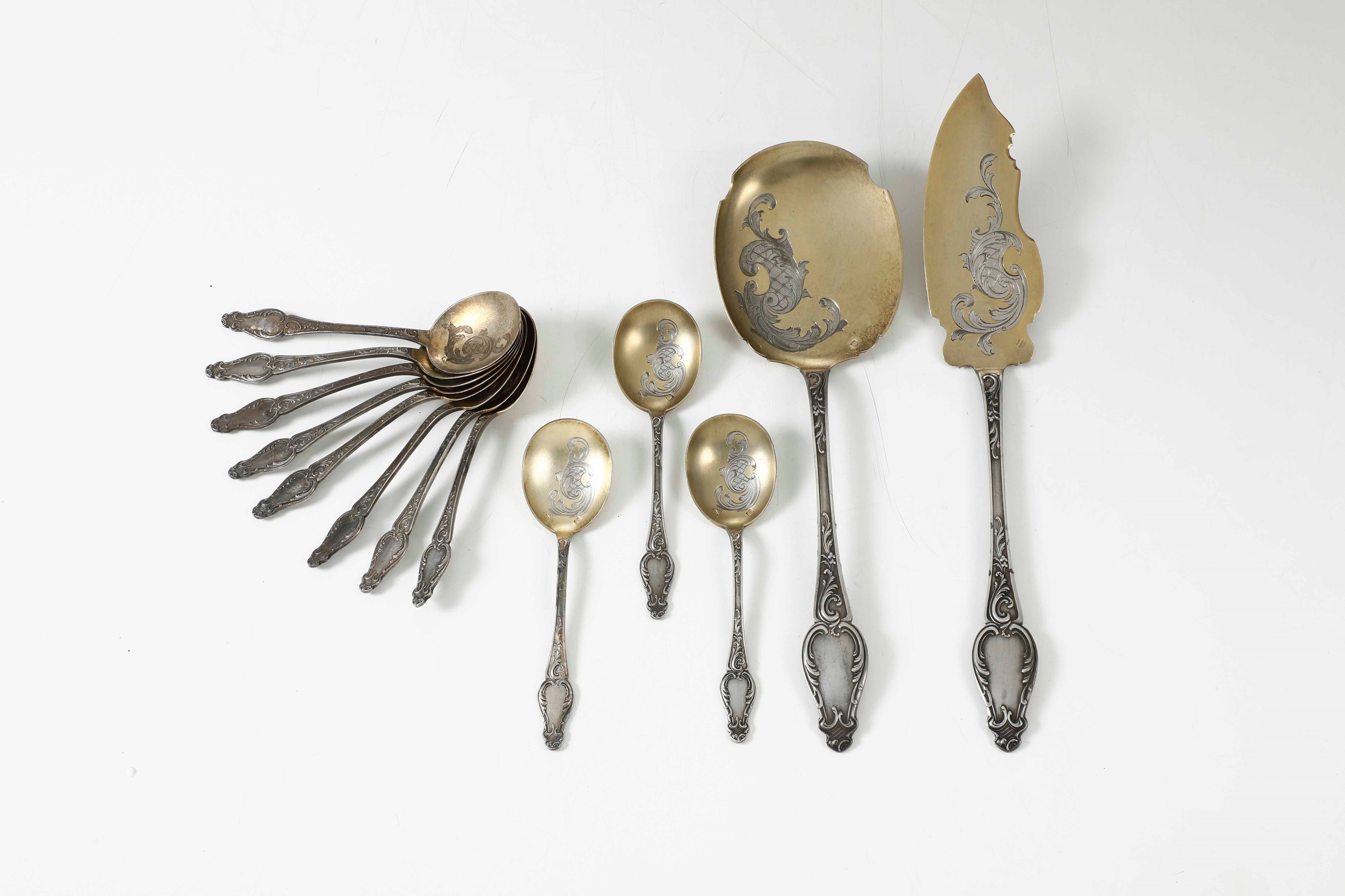 Insieme di 11 cucchiaini in argento e due posate da portata, Russia