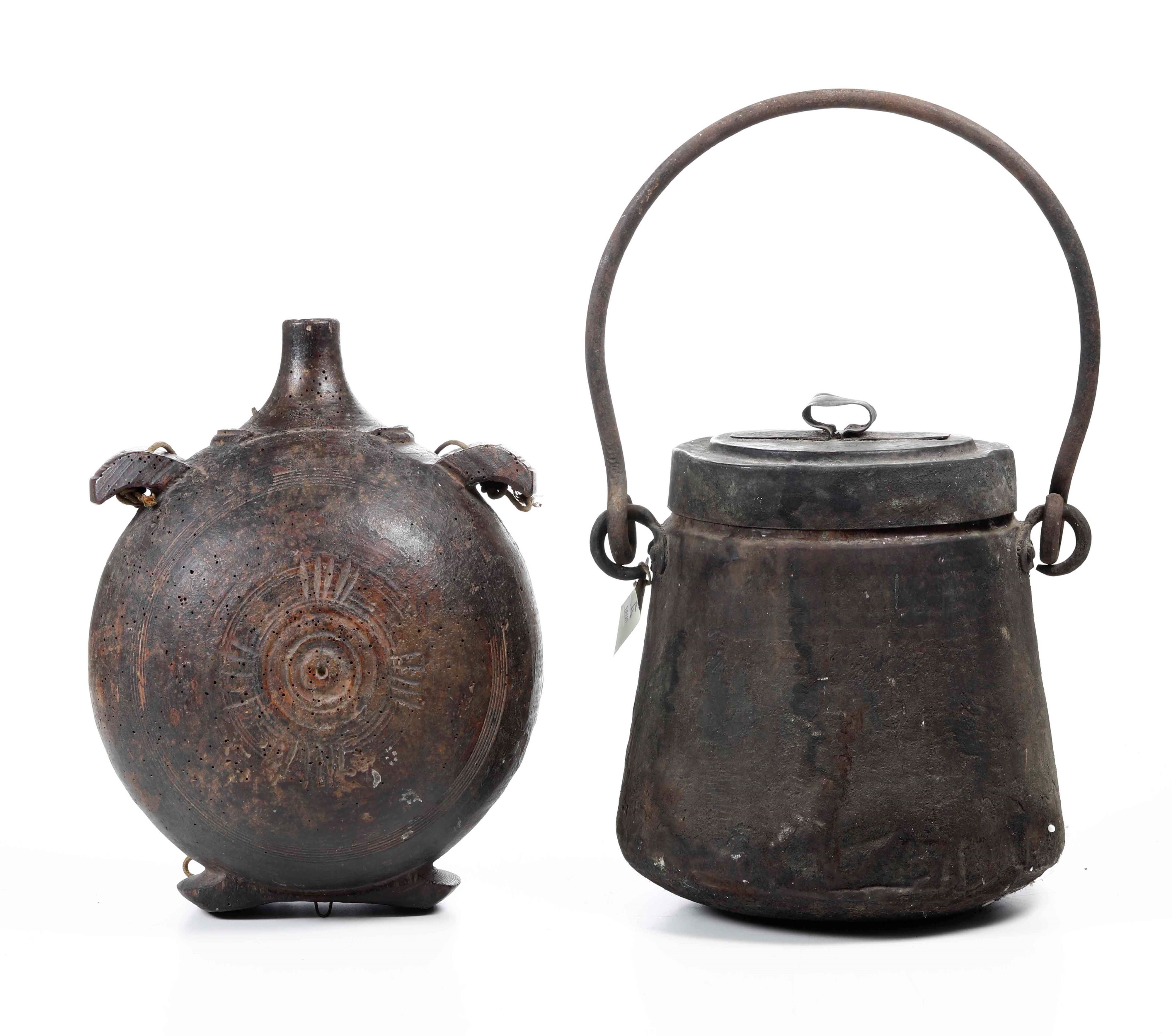 Lotto composto da vaso in metallo con manico e coperchio e fiasca in legno