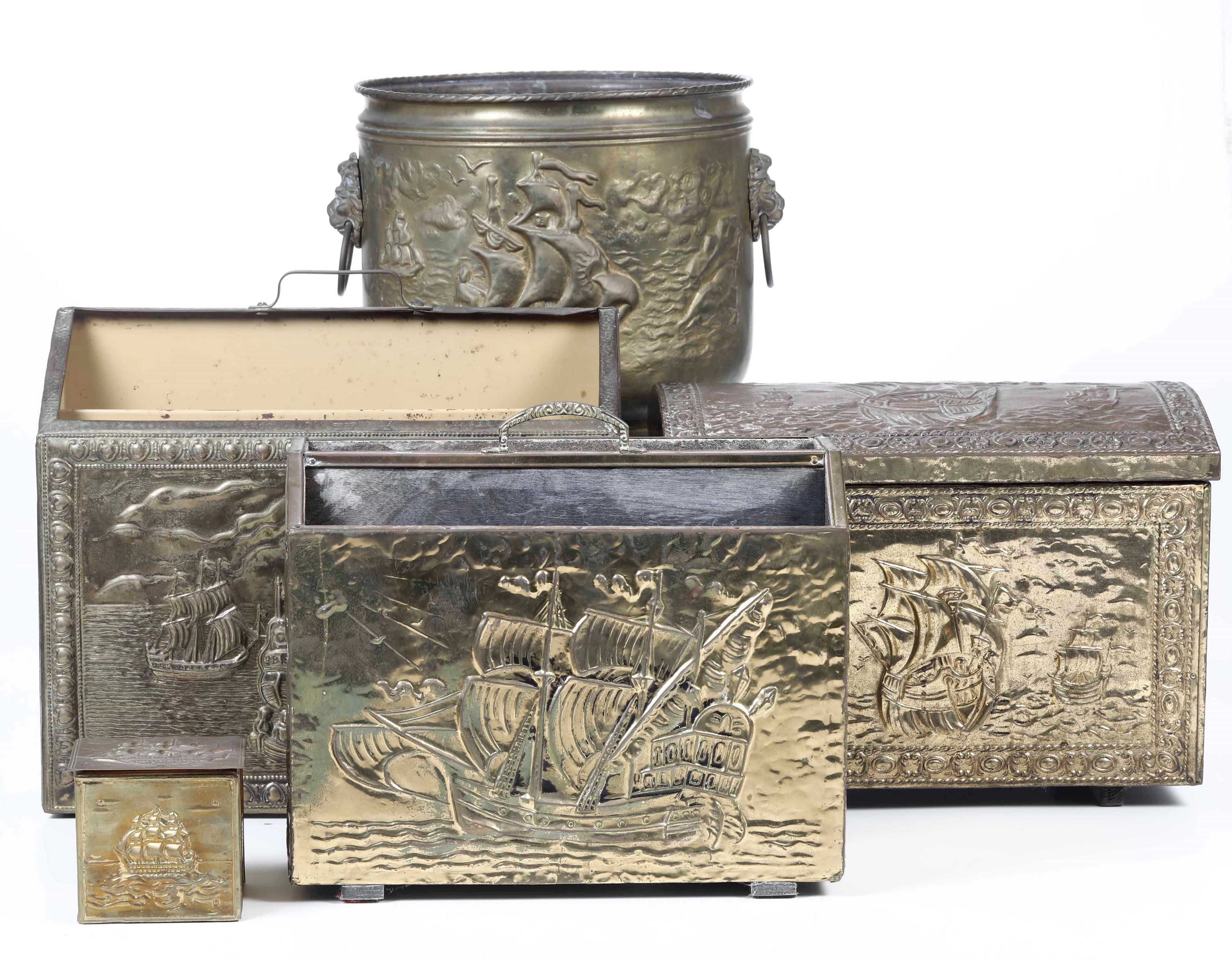 Lotto di due bauli, due portariviste e un vaso fioriera in ottone sbalzato a soggetto [..]