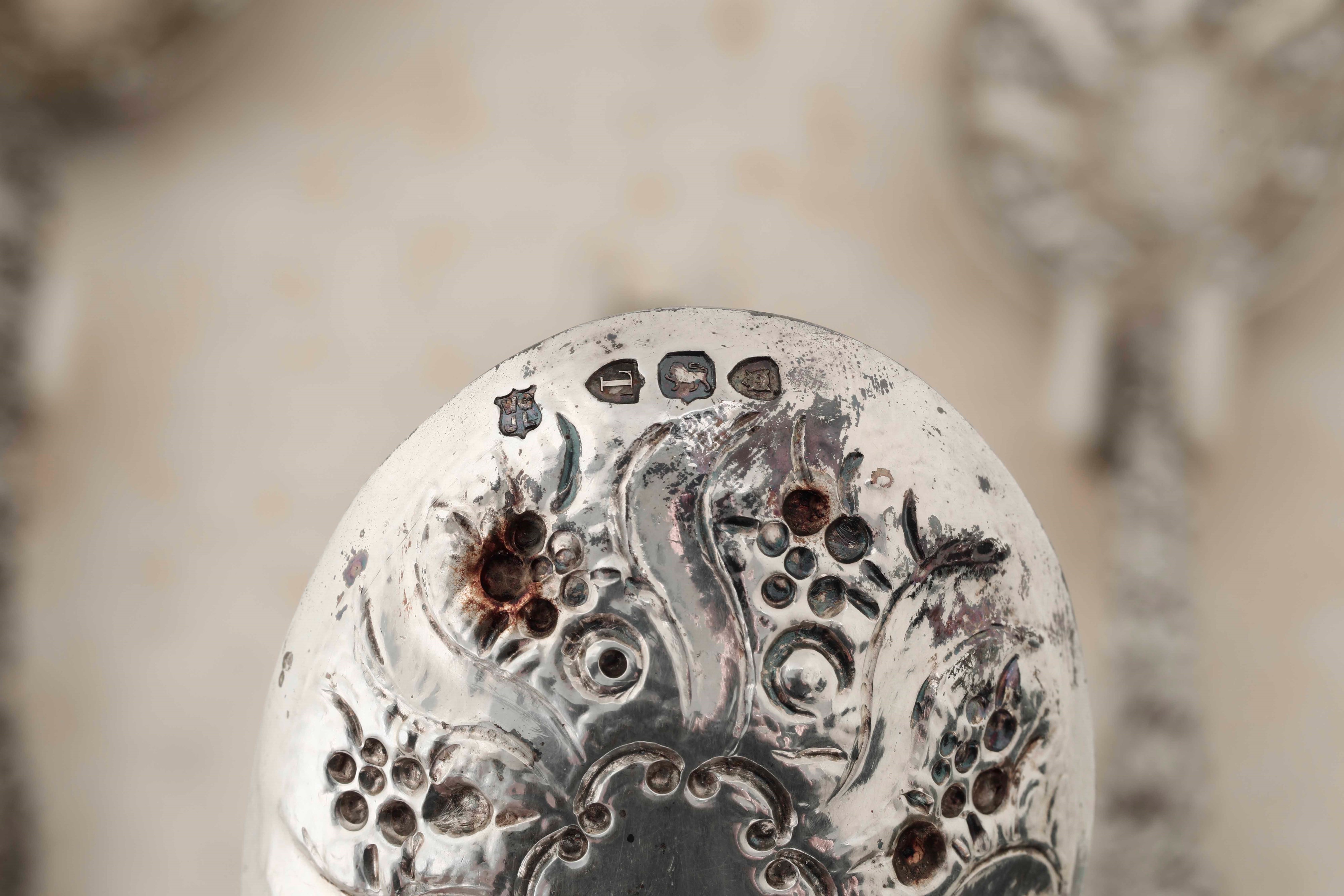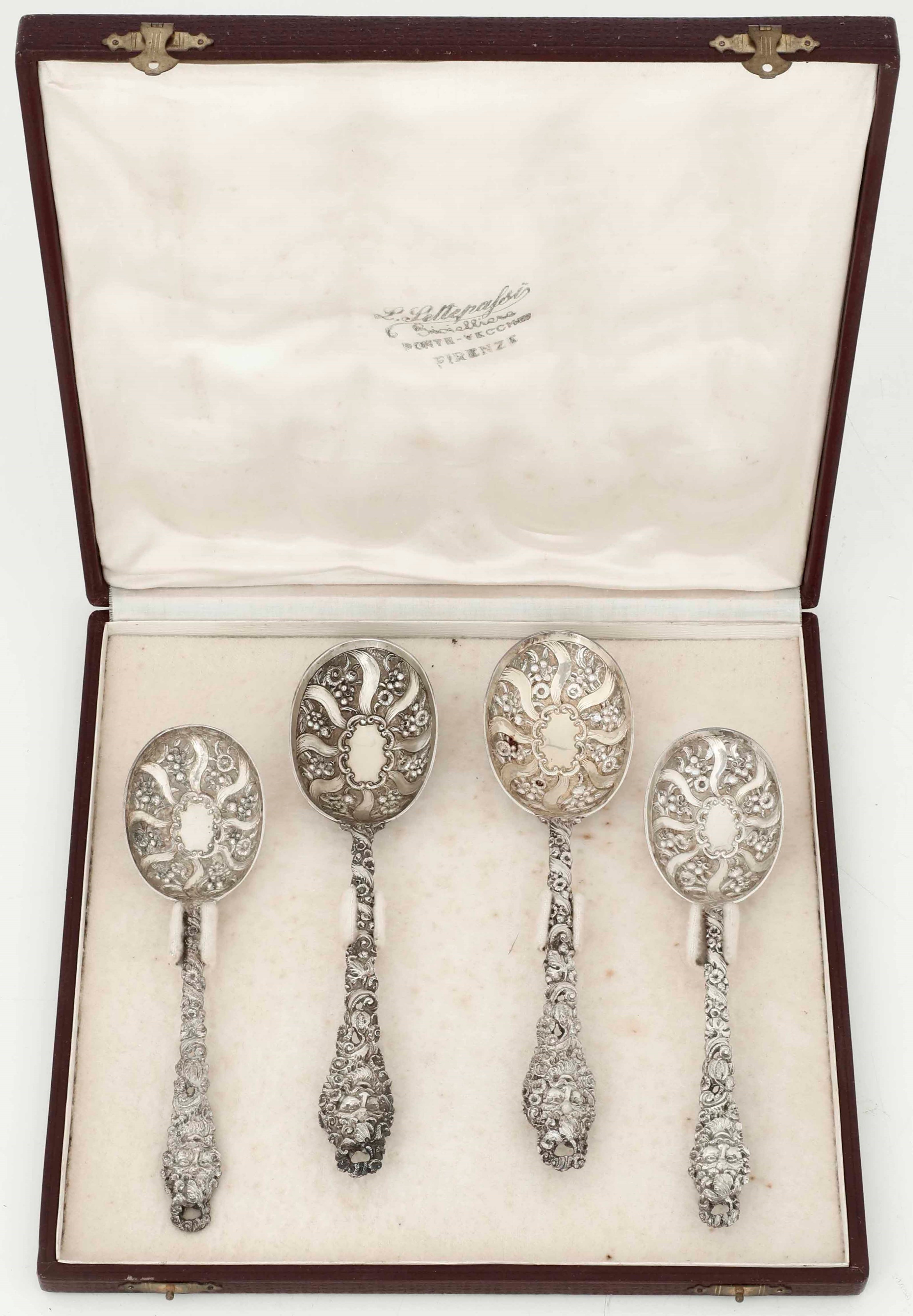 Set di quattro cucchiai in argento sterling fuso, sbalzato e cesellato. Inghilterra, [..]