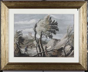 Scuola della fine del XVIII secolo Paesaggio con pastori e contadini
