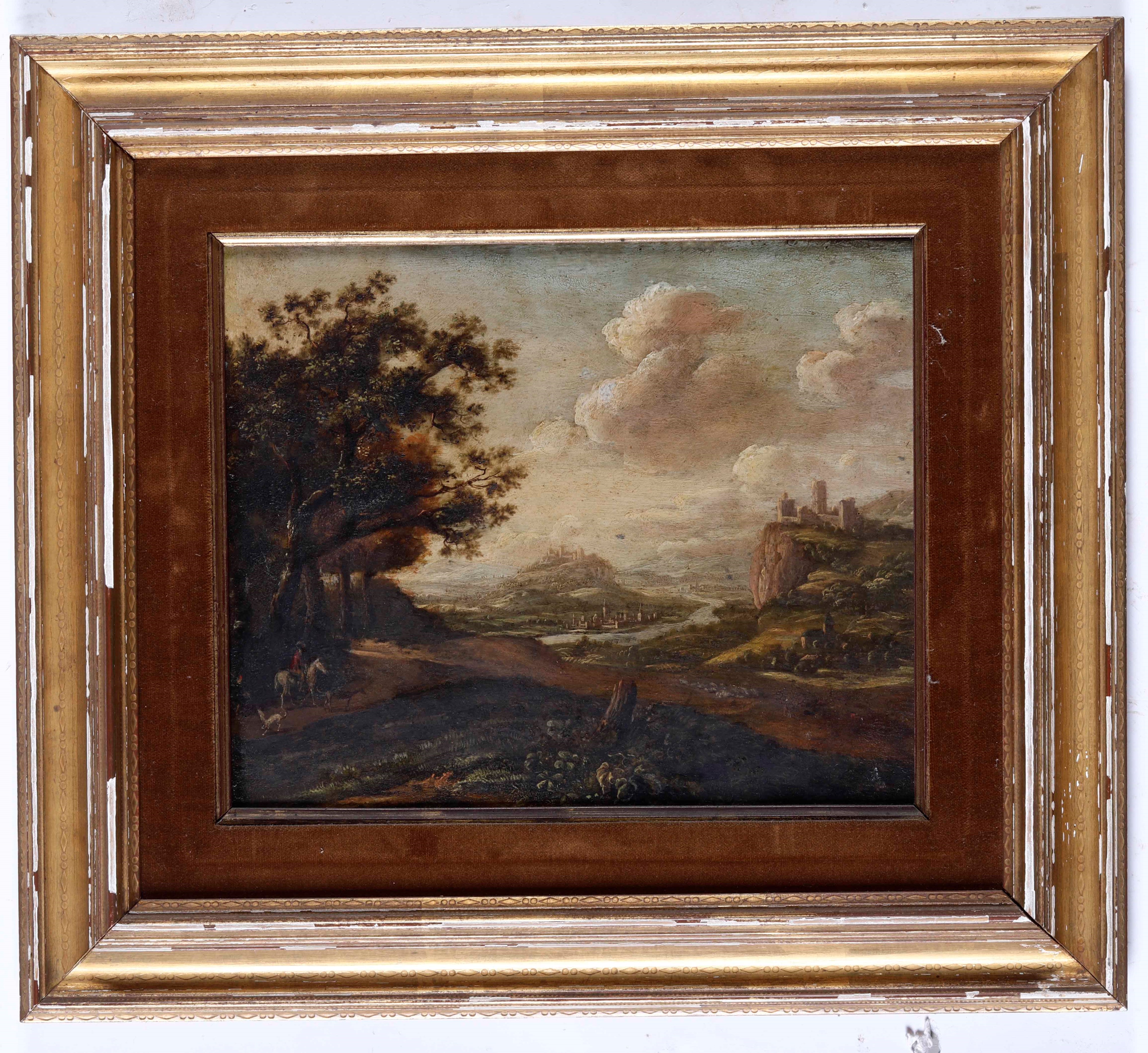 Scuola fiamminga del XVIII secolo Paesaggio con personaggio a cavallo