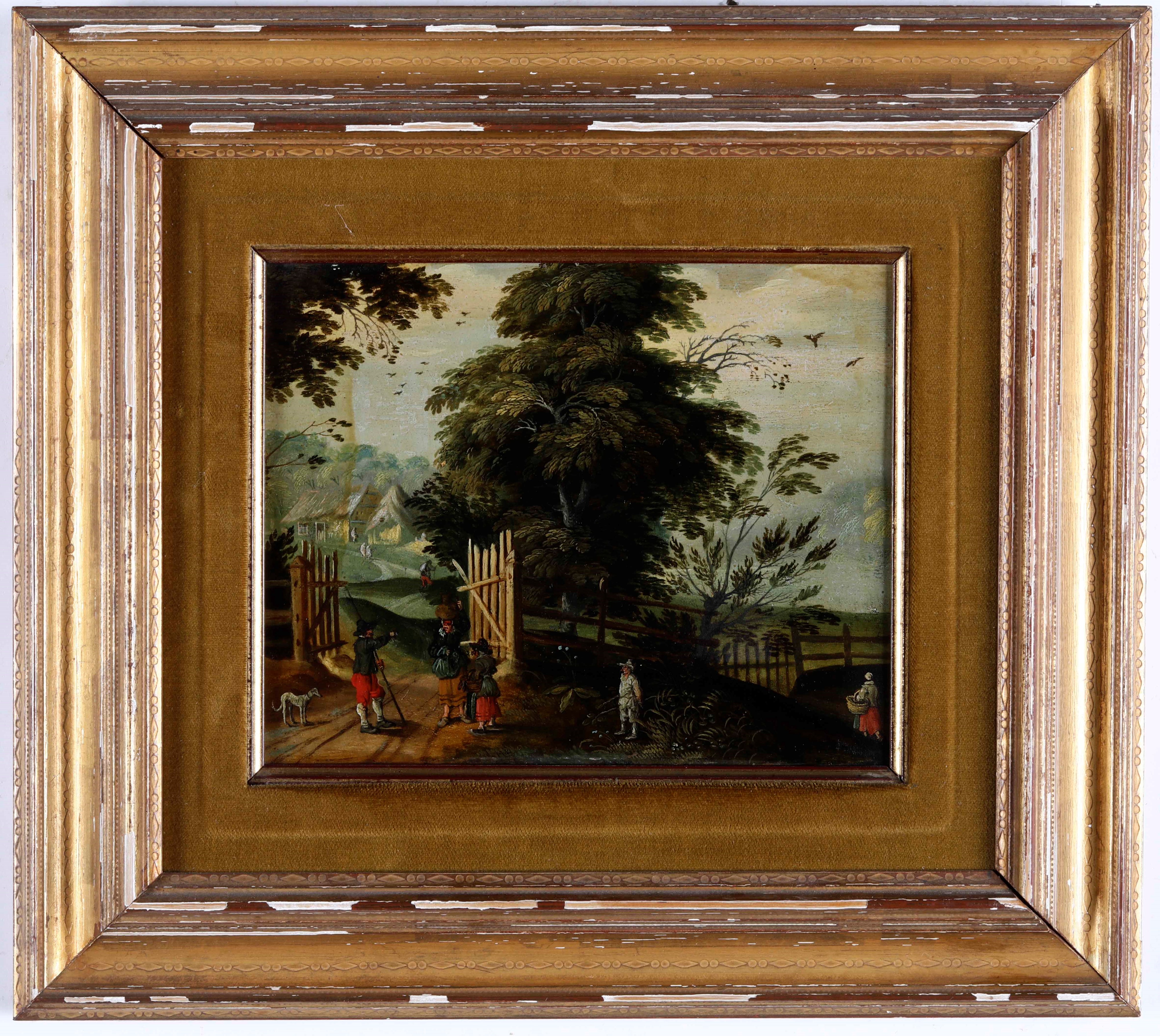 Scuola fiamminga del XVIII secolo Veduta di villaggio con viandanti e contadini