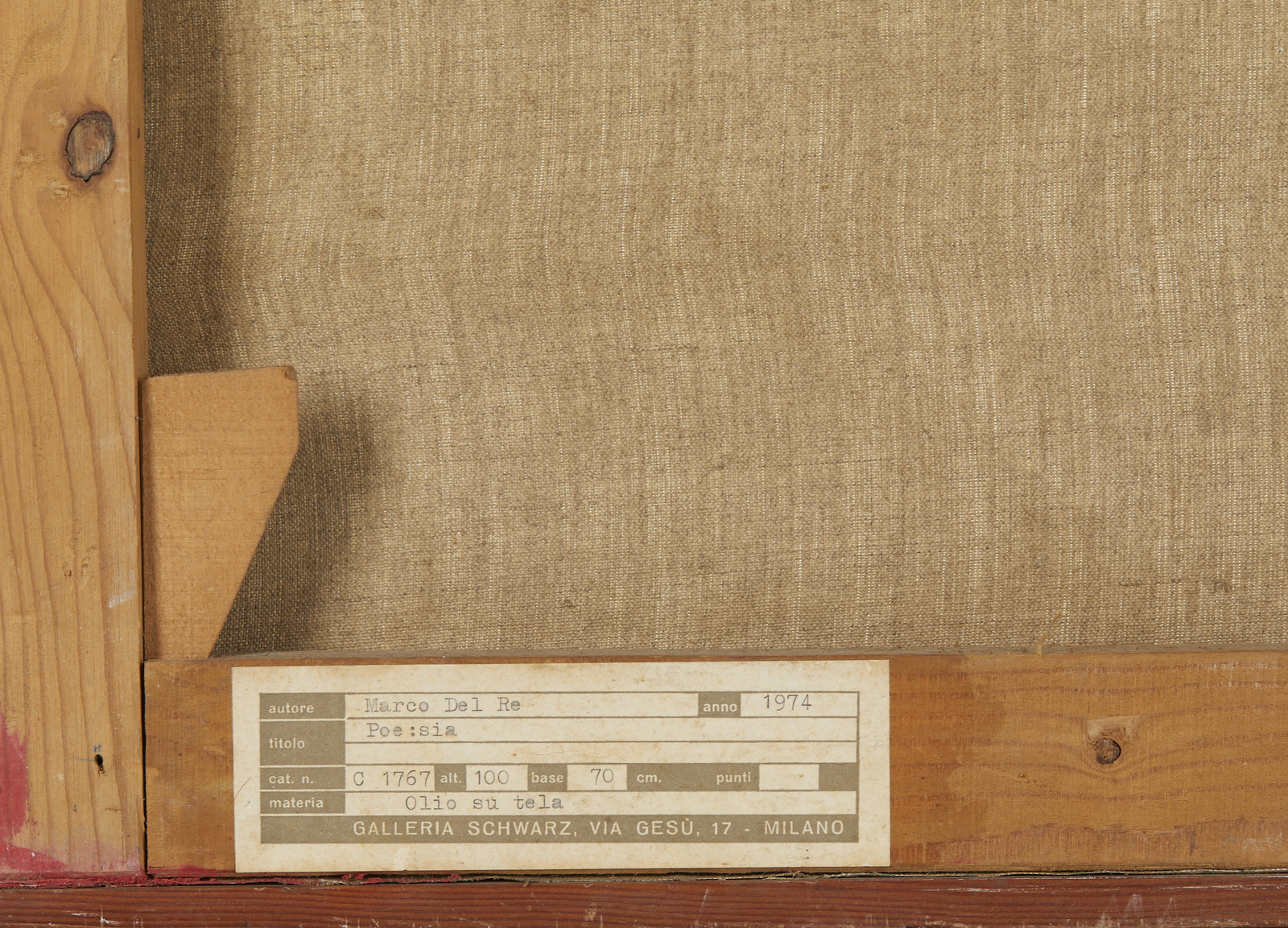 Al retro titolo e cartiglio descrittivo Galleria Schwartz, Milano. Esposizioni: Marco del Re, Galleria Schwartz, Milano, 6 maggio-7 giugno 1975. Pubblicazioni: Catalogo della mostra Marco del Re, Galleria Schwartz, Milano, 6 maggio-7 giugno 1975, tav 12, p. 27. Lievi difetti.