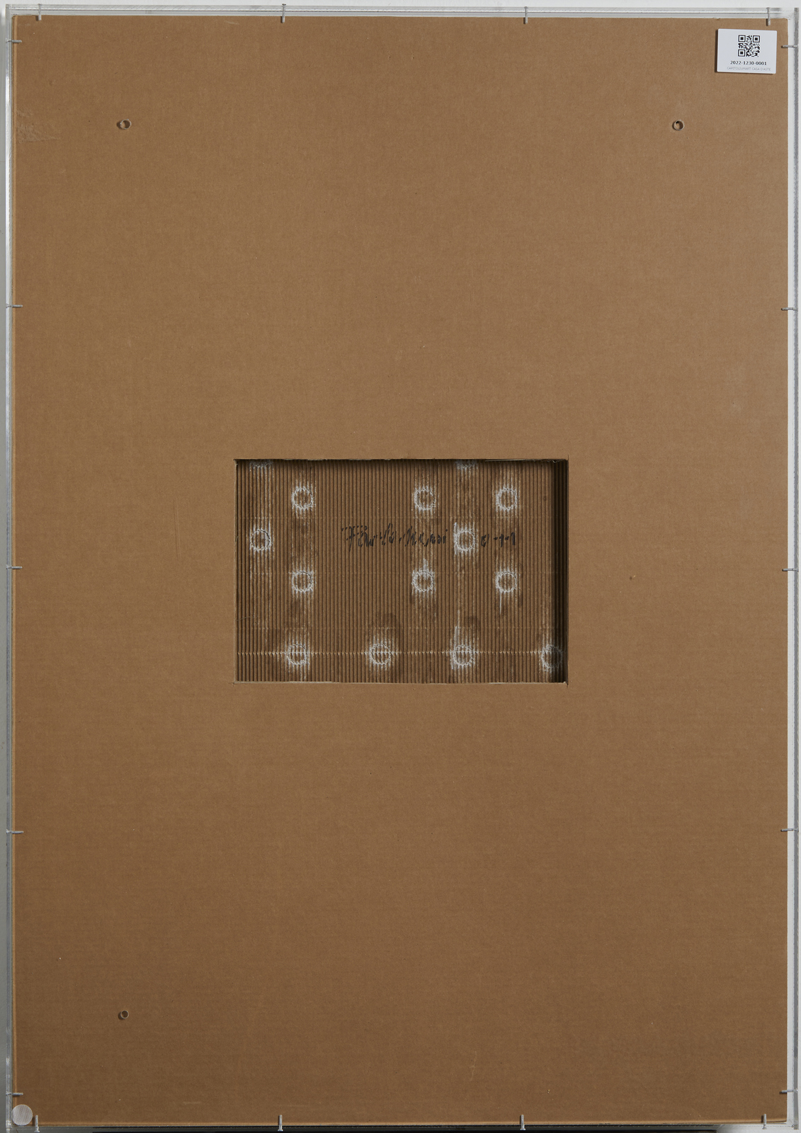 Al retro firma e anno. Autentica dell'artista su fotografia. Certificato di autenticità rilasciato da Arteinvestimenti, Milano, come da documentazione allegata all'opera. Entro teca in plexiglass.