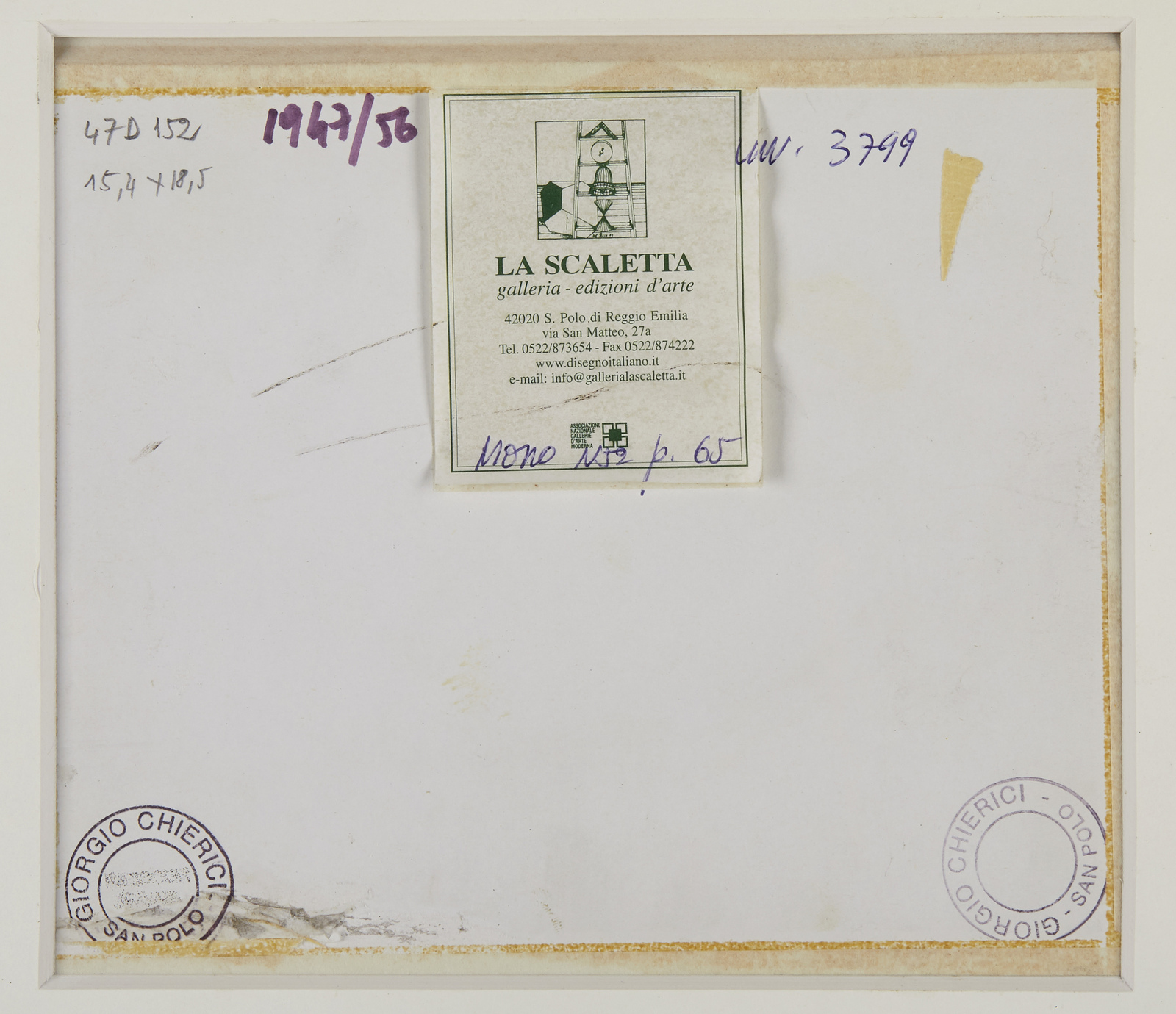 Firma in basso a destra. Al retro cartiglio Galleria La Scaletta, San Polo di Reggio Emilia e timbri Giorgio Chierici, San Polo di Reggio Emilia. Certificato di autenticità Galleria La scaletta con timbro Archivio Afro, Roma. Pubblicazione: Catalogo generale - disegni dal 1932 al 1947, Volume primo, a cura di Mario Graziani, Edizioni La Scaletta, p.272 ill.56.
