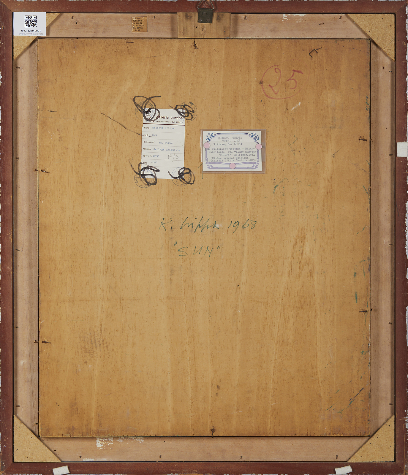 Al retro titolo, firma, anno, timbro e cartiglio descrittivo Galleria Cortina, Milano. Pubblicazioni: Crippa, Edizioni Galleria d'Arte Cortina, Milano, febbraio 1971. Si ringrazia la Galleria Cortina, Milano, per ave confermato la provenienza dell'opera. Provenienza: Galleria Cortina, Milano. Collezione privata. Lievi difetti.