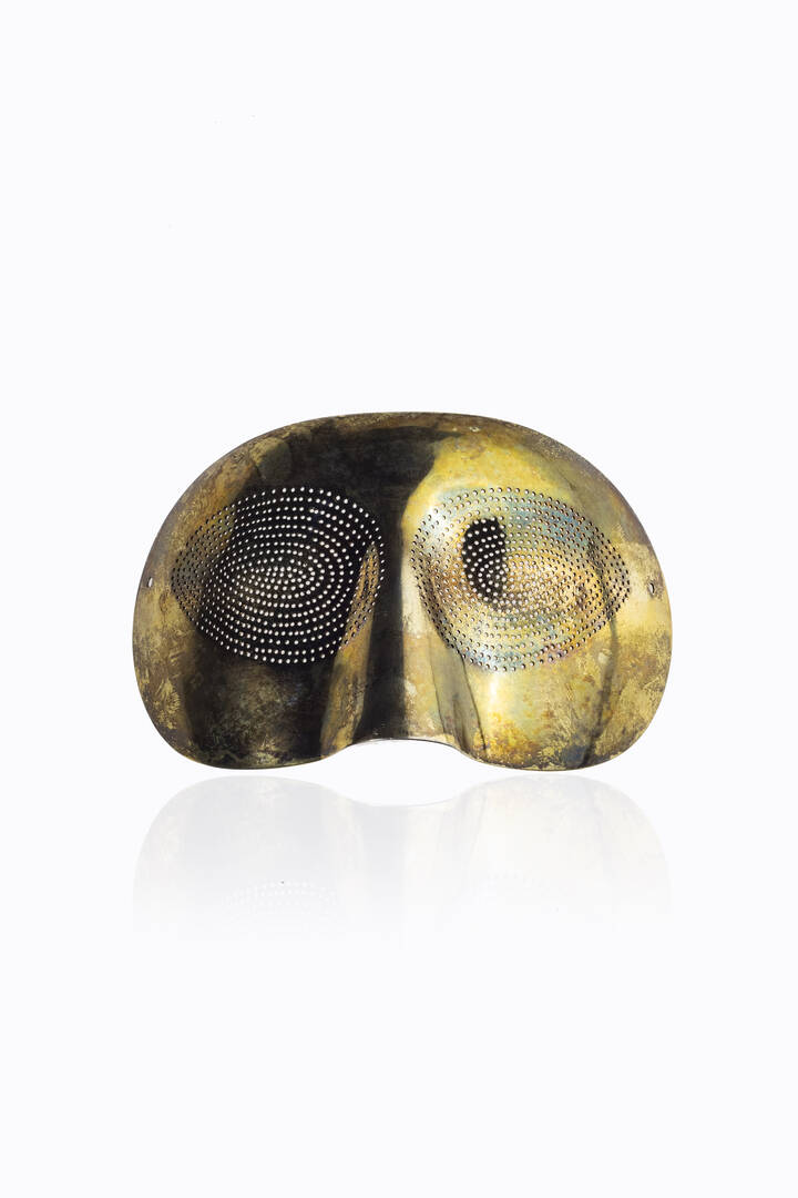9 5x14 5 scultura a forma di maschera in argento 925/1000 placcata in oro es. X/XV Opera incisa con la firma MR la data 1974/78 il numero X/XV il timbro GM e il timbro della foundry Opera realizzata nel 1974-78 in una tiratura di 100 esemplari più 15 prove d'artista a numeri romani edito da GEM Montebello Milano Andrew Strauss e Timothy Baum del Man Ray Expertise Committee hanno confermato l'autenticità di quest'opera la quale sarà inclusa nel Catalogo degli oggetti e delle sculture di Man Ray attualmente in preparazione. Già Collezione privata Italia Bibl.: Jean-Hubert Martin Brigitte Hermann Rosalind Krauss Objets de mon affection Man Ray Scultpure et Objets Catalogue raisonné 1983 p. 163