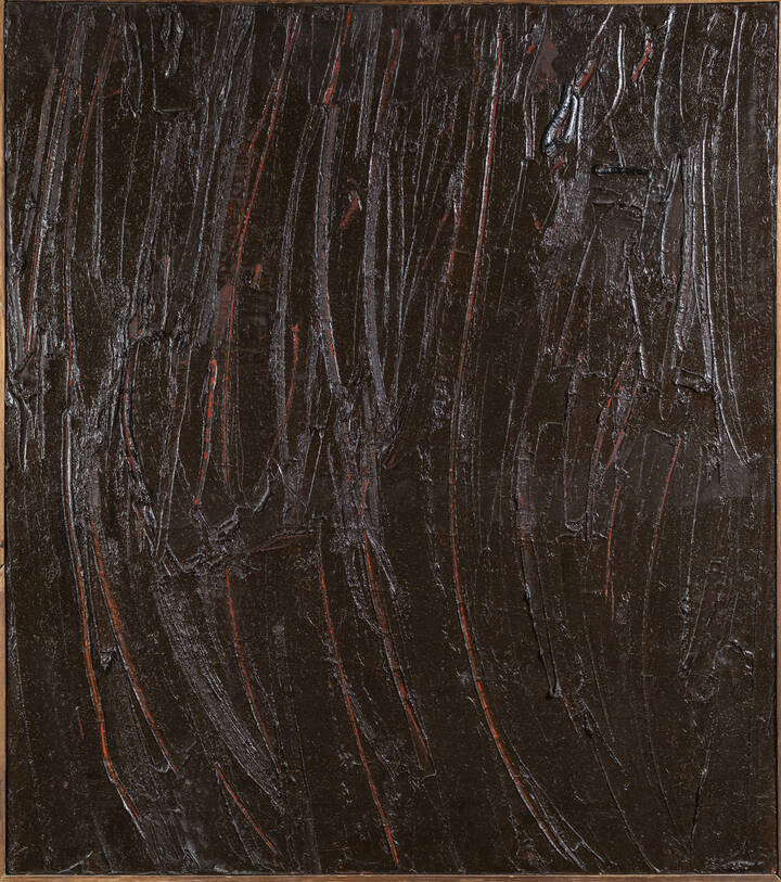 90x80 olio su tela Opera firmata e datata al retro ove è iscritta Marrone / con curva / olio su tela 1988 Già Galleria Martano Torino (etichetta al retro sul telaio Esp.: - 1989 gennaio/febbraio Torino Galleria Martano (etichetta al retro sul telaio)