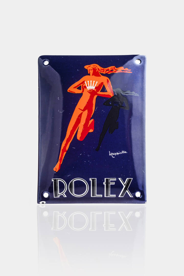 14 5x10 cm per la maison Rolex in metallo smaltato raffigurante una donna in rosso recante in mano la corona del marchio.
