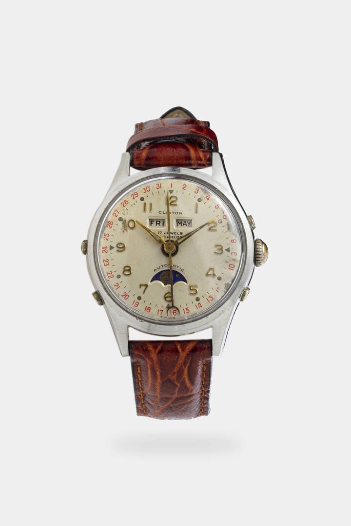 Diam. 33 mm Cassa in acciaio con fondello a vite. Quadrante argento patinato con numeri arabi applicati. Presenti al 12 le finestrelle indicanti giorno e mese ed al 6 le fasi lunari. La data è serigrafata ai limiti del quadrante in rosso. Movimento a carica manuale