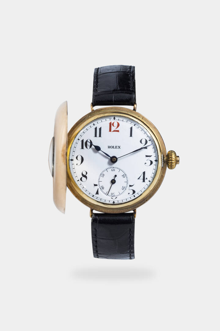 Diam. 34 mm Cassa in oro 9 Kt con fondello a cerniera e particolare protezione del vetro denominata occhio di bue. Quadrante in porcellana con numeri Breguet smaltati. Presenti le iniziali W&D tipico degli orologi prodotti al tempo della nascita di Rolex e sono le iniziali dei due fondatori Wilsdorf & Davis. Movimento a carica manuale marchiato. Il cinturino dell'orologio qui fotografato poiché eseguito con pellame di specie protetta non è in vendita ma presentato a solo scopo dimostrativo/ espositivo. Al momento della vendita dell'orologio tale cinturino non verrà fornito al nuovo acquirente