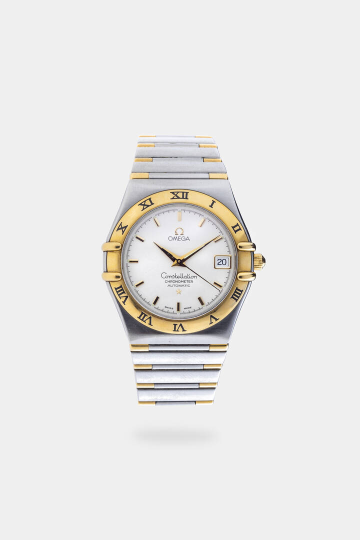 Diam. 35 mm Cassa in acciaio con lunetta in oro recante incise le 12 ore e fondello in vetro. Quadrante argento guilloché indicazione centrale dei secondi continui. Bracciale integrato in acciaio e oro con chiusura a scomparsa. Movimento a carica automatica