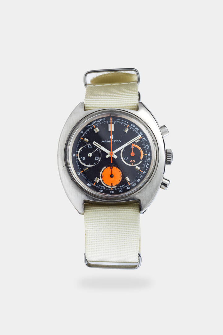 Diam. 40 mm Cassa in acciaio con fondello a vite. Quadrante nero con indici geometrici applicati. Contatore secondi continui al 9; 30 minuti al 3; 12 ore al 6. Movimento a carica manuale Valjoux 7736