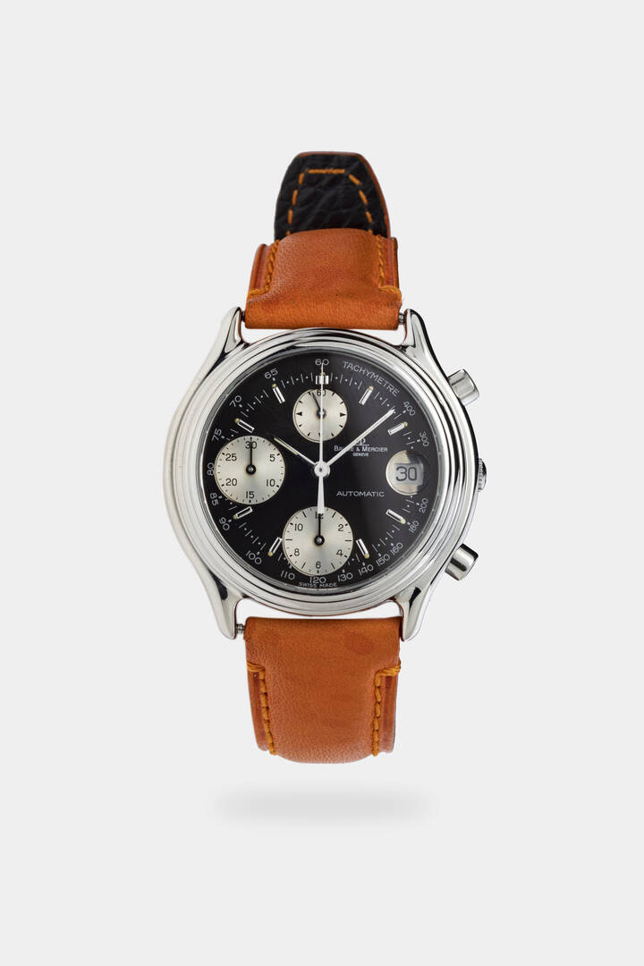 Diam. 37 mm Cassa in acciaio con fondello a pressione. Quadrante antracite con indici geometrici applicati datario al 3; contatore 12 ore al 6 e 30 minuti al 9 secondi continui al 12 Movimento a carica automatica