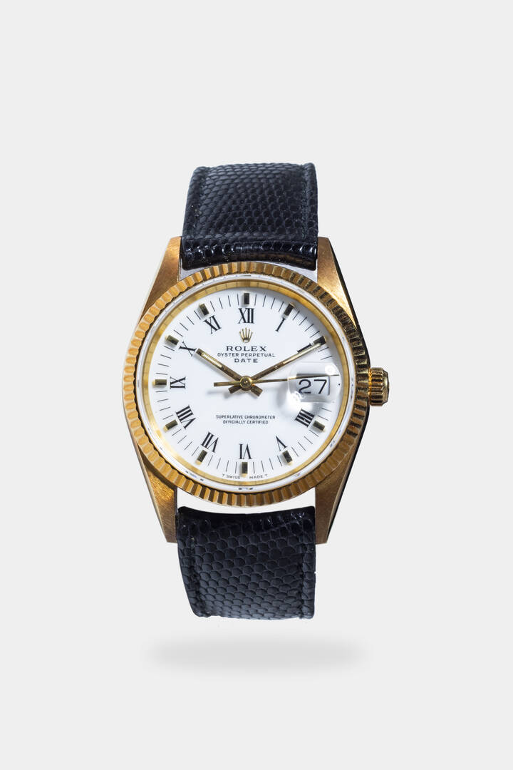 Diam. 34 mm Cassa in oro con fondello a vite e lunetta godronata. Quadrante bianco con indici geometrici luminescenti applicati e numeri romani serigrafati indicazione centrale dei secondi continui e datario ad ore 3. Movimento a carica automatica cal.3135. Orologio in stato di NOS completo di garanzia bollino sul fondello. Orologio mai lucidato.