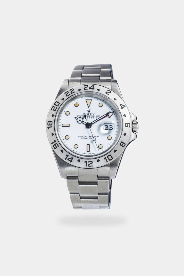 Diam. 40 mm Cassa in acciaio con fondello a vite e lunetta recante incise le 24 ore. Quadrante bianco con indici geometrici luminescenti applicati di colore ocra denominati “Chicchi di Mais”. Presente la lancetta del secondo fuso orario ovvero la complicazione GMT indicazione centrale dei secondi continui e datario ad ore 3. Bracciale in acciaio integrato con chiusura clasp. Movimento a carica automatica cal.3185. Orologio completo di garanzia dell'epoca.