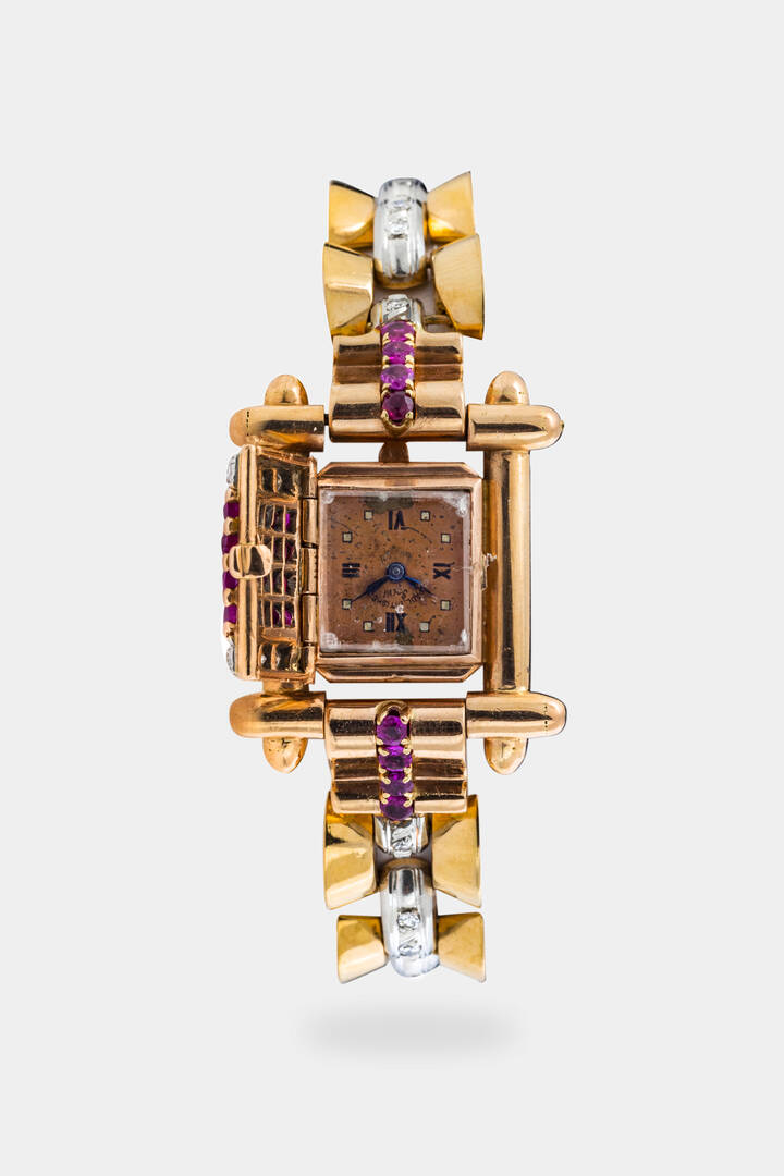 22x23 mm Cassa in oro rosa lavorata con copri quadrante in diamanti e rubini. Quadrante salmone con numeri romani serigrafati ai quarti. Bracciale integrato con maglia centrale con diamanti. Movimento a carica manuale.