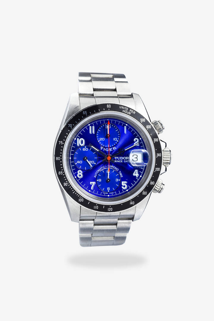 Diam. 40 mm Cassa in acciaio con fondello a vite tasti a vite della cronografia e lunetta nera tachimetrica base 500. Quadrante blu con numeri arabi serigrafati datario al 3 secondi continui al 9 indicazione dei 30 minuti cronografici al 12 e delle 12 ore al 6. Bracciale Oyster in acciaio con chiusura clasp. Movimento a carica automatica cal.7750 Completo di garanzia traforata tag e bollino sul fondello. Quadrante molto raro.